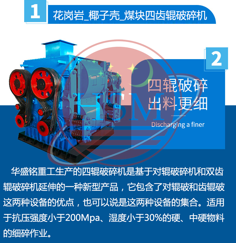 【產(chǎn)品價(jià)格】: 電議/面議???【生產(chǎn)能力】: 2-500t/小時(shí) 【進(jìn)料粒度】:?≤90mm???【出料粒度】:??≤0.1-50mm? 【應(yīng)用范圍】: ?四輥破碎機(jī)適用于抗壓強(qiáng)度小于200Mpa、濕度小于30%的硬、中硬物料的細(xì)碎作業(yè)。如焦炭、煤、陶瓷原料、石英石、石灰石、長(zhǎng)石、水渣、石膏、粘土等固體物料。? 【產(chǎn)品介紹】: ?華盛銘重工生產(chǎn)的四輥破碎機(jī)是基于對(duì)輥破碎機(jī)和雙齒輥破碎機(jī)延伸的一種新型產(chǎn)品,它包含了對(duì)輥破和齒輥破這兩種設(shè)備的優(yōu)點(diǎn),也可以說(shuō)是這兩種設(shè)備的集合。本機(jī)器具有使用維修費(fèi)特低、破碎比大、性能可靠、粉塵少、噪音低等特點(diǎn)。